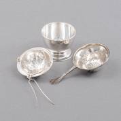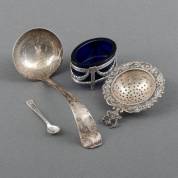 Drie zilveren objecten: 1e gehalte zoutschaaltje met blauw glazen binnenbakje en lepeltje, en 2e gehalte dienlepeltje en theezeef, totaalgewicht zonder glazen binnenbakje 99 gram
