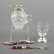 2e gehalte zilveren zuurvorkje met streepagaten heft, kristallen melkkannetje met 2e gehalte zilveren montuur, borrelglaasje met zilveren montuur en paar zilveren monturen gevormd als drakenkop en staart, brutogewicht 298 gram, vorkje 15 cm -zuurvorkje gebroken-