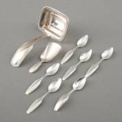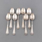 Acht 2e gehalte zilveren theelepeltjes met kruisband, meester: Johannes Albertus Adolf Gerritsen, Zeist, 1906-1908, gewicht 76 gram, 10,5 cm -gebruikssporen-