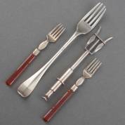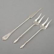 Paar 2e gehalte zilveren vleesvorkjes met gedraaide steel en bokkenpoot, meester: Gerrit Regtdoorzee Greup, Schoonhoven, 1888-1911, en 2e gehalte zilveren cakeprikker, J.M. van Kempen & Zonen, Voorschoten, 1858-1924, gewicht 51 gram, lengte cakeprikker 19 cm