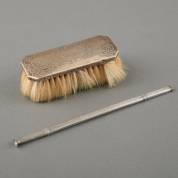 Tafelborstel met 2e gehalte zilveren kap voorzien van oud-Hollands decor, 1895, en geribde 2e gehalte zilveren breipenhouder, meesterteken onduidelijk, 19e eeuw, brutogewicht 191 gram, lengte breipenhouder 24,5 cm