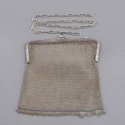 3e gehalte zilveren maliëntas met losse ketting, de beugel met resten van blauw emaille, gewicht 114 gram, 12 × 14 cm -defecten-