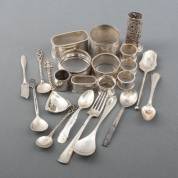 Divers zilverwerk, diverse gehaltes, waaronder: diverse theelepels en servet- en vingerdoekringen, gewicht 369 gram