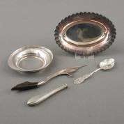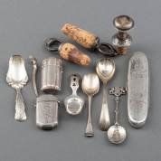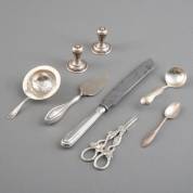 Divers klein zilverwerk, diverse gehaltes en meesters, waaronder: broodmes met zilveren heft, dubbel rondfilet, druivenschaar, en theezeefje brutogewicht 349 gram, broodmes 29 cm -gebruikssporen-
