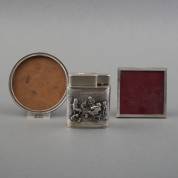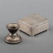 2e gehalte zilveren tabaksdoosje met geometrisch lijnendecor op het deksel en houten interieur, Duitsland, 20e eeuw, en 2e gehalte zilveren tafelkandelaartje, Nederland, met gegraveerde datum op de voet: 29-6-1963, brutogewicht 252 gram, hoogte kandelaar 6 cm