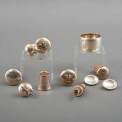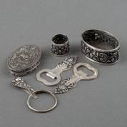Divers klein zilverwerk, 1e en 2e gehalte, bestaande uit: servetband met inscriptie: 'Gertrude', paar kaasduimen met monogram, zilveren stop, zilveren schenktuit en zes diverse zilveren flessenstoppen, brutogewicht 214 gram, servetband Ø 5,2 cm