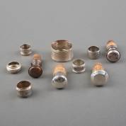 Vijf diverse 2e en 3e gehalte vingerdoekringen en één servetband, daarbij: vier diverse 2e gehalte zilveren flessenstoppen, diverse meesters en jaren, brutogewicht 135 gram -defecten-