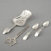 2e gehalte zilveren opengewerkte schep met gravédecor, meester: Griderius Veersema, Groningen, 1854, twee 2e gehalte zilveren theelepels met bewerkte steel, meester: Johannes Schijfsma, Woudsend, 1857 -één met herstelling-, en handwerkschaar met zilveren grepen, 19e eeuw, gewicht zilver 57 gram, brutogewicht schaar 39 gram