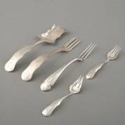 2e gehalte zilveren gembercouvert met gravédecor, meester: Johannes Martinus Steiger, Amsterdam, 1848, daarbij: drie diverse dienvorkjes met gravédecor, 19e eeuw, gewicht 108 gram, lengte gembercouvert circa 19 cm -deukjes-