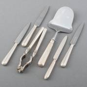 Kaasschaaf met 2e gehalte zilveren heft, Haags lof, notenkraker met zilveren heft, voorzien van belastingkeur voor ongewaarborgde items tussen 1906-1953, drie fruitmesjes met 2e gehalte zilveren heft, en 2e gehalte zilveren fruitmesje met geribd heft, brutogewicht 368 gram, notenkraker 16,5 cm