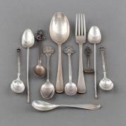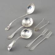 Divers 2e en 3e gehalte zilveren diengerei, diverse makers en jaren, bestaande uit: compôtelepel, roomlepel, vruchtenschepje, klontjestang en twee confiturevorkjes, gewicht 104 gram, compôtelepel 16 cm