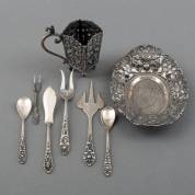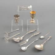 Divers BWZG Djokja: bonbonschaaltje, maggihouder, cakevork, vleesvorkje, botermesje, twee theelepeltjes en een cocktailvorkje, gewicht 270 gram