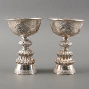 Paar BWZG boterlampjes met reliëfdecor, Tibet, 19e/20e eeuw, gewicht 568 gram, 16,5 × Ø 12 cm