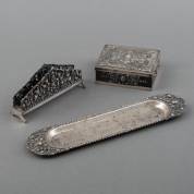 BWZG Djokja sigarettendoosje met houten interieur, brievenstandaard en pennenbakje, alle met lotusdecor, brutogewicht 402 gram, pennenbakje 25 cm