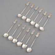 Twaalf BWZG Djokja theelepels met getorste steel bladvormige bak en wajang op de steel, gewicht 123 gram, circa 12 cm
