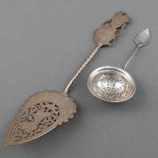 BWZG Djokja taartschep met opengewerkt Wajangdecor, daarbij: 2e gehalte zilveren theezeef met getorste steel eindigend in blad, gewicht 86 gram, 24 cm