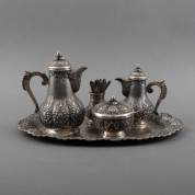 BWZG Djokja gehamerd koffieservies met lotusdecor, bestaande uit: ovaal dienblad, koffiekan, melkkan, bedekte suikerpot met suikerlepel en lepelvaasje met negen koffielepeltjes, gewicht 2291 gram, koffiekan 21 cm, dienblad 40 × 27 cm -met aankoopbewijs-