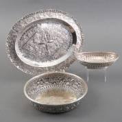 Drie BWZG Djokja schalen met rijk gedreven decors, gewicht 729 gram, ovale platte schaal 34 × 17,5 cm -ronde schaal met defect-
