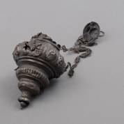 BWZG godslampje met gegraveerd decor, gewicht zilver minimaal 175 gram, inclusief ophanging 39 × Ø 13 cm -vele defecten en ontbrekende onderdelen-
