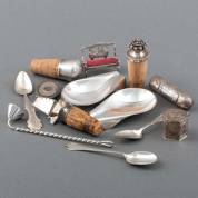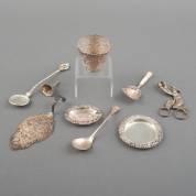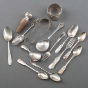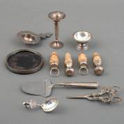 Divers klein zilverwerk, voornamelijk 2e gehalte, diverse meesters en jaren, waaronder: servetband, flessenstop, klontjestang, suikerschep etc., gewicht zilver 166 gram, daarbij: drie verzilverde lepeltjes