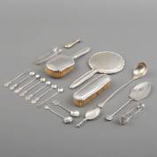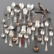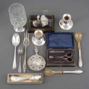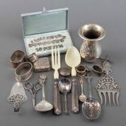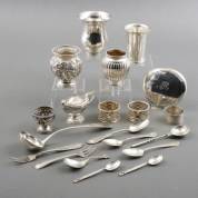 Divers zilverwerk, diverse gehaltes, waaronder: paar 1e gehalte zilveren lepeltjes, meester: Georg Jensen, Denemarken, 20e eeuw, en 2e gehalte zilveren lepelvaasje met pseudokeuren, gewicht 919 gram