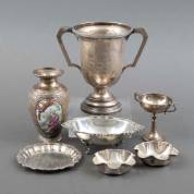 Divers zilverwerk, diverse gehaltes, waaronder: 2e gehalte (900/1000) bridgetrofee, volgens de huidige eigenaar, de dochter van Spiridon Joannidis, is deze beker door hem gewonnen in een duo met acteur Omar Sharif, Egypte's toenmalige beste bridgespeler, Egypte, 1960-1961, en Perzisch vaasje met emaille medaillons, totaal brutogewicht 947 gram, afmetingen trofee 16,5 × 17 × 11,5 cm -defecten aan email-