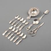 Divers klein zilverwerk, diverse gehaltes en jaren, waaronder: koffielepeltjes met gravédecor, theezeef, en druivenschaar met zilveren grepen, brutogewicht 142 gram, theezeef 12,5 × Ø 8,5 cm -defecten-