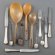 Divers zilveren bestek en diengerei, diverse gehaltes, waaronder: één dinermes en drie dessertmessen met 3e gehalte zilveren heft, en één dessertvork, Haags lof, gewicht zilver 123 gram, brutogewicht messen 272 gram