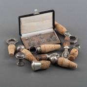Set 3e gehalte zilveren tafelnummers in etui, daarbij tien diverse zilveren flessenstoppen, brutogewicht 205 gram -gebruikssporen-