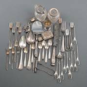 Divers kleinzilver, diverse gehaltes: asbakjes, vleesvorkjes, theeschepjes, etc. brutogewicht 449 gram