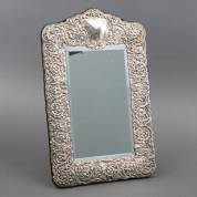 Tafelspiegel met 2e gehalte zilveren lijst met gedreven decor van bloemen en medaillon, met velours bekleed houten achterzijde en standaard, 42 × 27 cm -gebruikssporen-