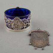 2e gehalte zilveren zoutschaaltje met blauw glazen binnenbak, met oud-Hollands decor, meester: Hollandia Zilversmeden, Zutphen, 1927, daarbij: 3e gehalte zilveren maliënbeursje, gewicht zilver 90 gram