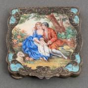 Geëmailleerde 3e gehalte zilveren poederdoos met decor van liefdespaar, circa 1900, brutogewicht 103 gram, 7 × 7 cm -spiegel defect-