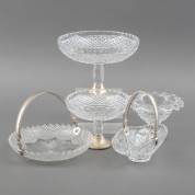 Twee kristallen tazza's op 2e gehalte zilveren voet met hetzelfde slijpsel, meester: C. Bos & Zoon, Amsterdam, 1979, twee kristallen schaaltjes met 2e gehalte zilveren hengsel afgezet met parelrand, grootste gemerkt 1909, en kristallen coupe op 2e gehalte zilveren voet, grootste tazza, circa 15 × Ø 20 cm -enkele gebruikssporen-