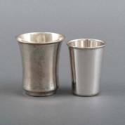 1e gehalte zilveren bekertje en 2e gehalte zilveren beker met uitstaande rand, bodem met persoonlijke inscriptie, gedateerd 1935, gewicht 111 gram, grootste 8,5 × Ø 7,2 cm