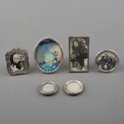 Zes 1e en 2e gehalte zilveren fotolijstjes met diverse decors, brutogewicht 270 gram, rechthoekig lijstje 10,5 × 6 cm -twee kleine ronde lijstjes met zware gebruikssporen en defecten-
