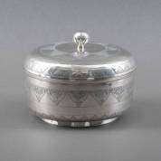 Ronde BWZG Djokja dekseldoos met gegraveerde Oosterse en geometrische motieven, de knop met bladdecor, gewicht 1112 gram, 15 × Ø 19 cm -gebruikssporen en flinke deuk in de rand-