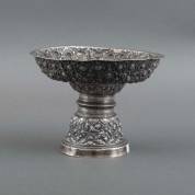 BWZG Djokja presenteerschaal op hoge voet, met rijk gedreven blad- en bloemdecor, brutogewicht 343 gram, 16 × Ø 21,5 cm -deukjes, enkele gaatjes gevuld met soldeer, mogelijk zit er wat vulling in de voet om schaal en voet te koppelen-