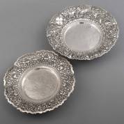 Twee gelijkende BWZG Djokja presenteerschalen met gecontourneerde ajourgezaagde rand, en staande op drie bolpootjes, gewicht 1163 gram, Ø 32 en Ø 29 cm