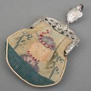 Geborduurde damestas aan 2e gehalte zilveren ajourgezaagde beugel met decor van figuren en bloemen en chatelainehaak met schild, meester: Barend Cornelis Verkerk, Amsterdam, 1844-1864, brutogewicht 69 gram