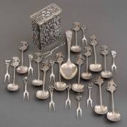 Twaalf 2e gehalte zilveren cocktailprikkers met bloemdecor, meester: T.J.F. Landmeter en J. Versluis, Schoonhoven, 1957-1993, daarbij: diverse BWZG Djokja lepels en doosje, gewicht 282 gram