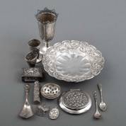 Divers zilverwerk, diverse gehaltes, waaronder 1e gehalte zilveren filigrain miniatuur: riksja, vijf 2e gehalte zilveren theelepels, komkommercouvert en paar lage 1e gehalte zilveren kandelaars, gewicht zilver minimaal 150 gram -naaigarnituur deels onedel-
