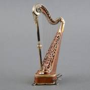Zilveren miniatuur: houten harp met 1e gehalte zilveren montuur en snaren, gesigneerd Sauchetti, Italië, 20e eeuw -lijmresten, zuil los-, hoogte 13,5 cm
