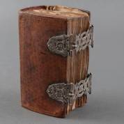 Kerkbijbeltje: Het Oude en Nieuwe Testament, de Psalmen en Catechismus. Dordrecht, 1750. Kl.8vo. lederen band uit de tijd met twee zilveren klampen, meester: Willem van de Goorberg, Leiden, 1793. Met gegraveerde titel en platen -band los, platen liggen los-