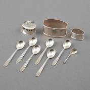 Divers 2e gehalte klein zilverwerk, diverse meesters, bestaande uit: zes mokkalepeltjes, ontwerp Gustav Beran, servetband en vingerdoekring met gegraveerd monogram, zoutlepeltje en miniatuur strijkijzer met pseudokeuren, gewicht 119 gram, servetband 6 × 3,5 cm
