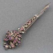 Zilveren bloemvormige sarpech, met in gouden zettingen gezet: roze saffier en bergkristal, Oosters, 19e eeuw, brutogewicht 24,8 gram, 12 × 3,5 cm -brochering van later datum-