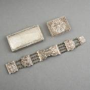 2e gehalte zilveren snuifdoosje met vermeil binnenzijde, het deksel met gegraveerd decor van hond, voluten en bladeren en monogram 'W.D.M.', filigrain luciferdooshouder en 2e gehalte zilveren armband gemaakt van bijbelklampen, gewicht 117 gram, snuifdoosje circa 1,5 × 8 × 4 cm -scharnierpen van snuifdoos ontbreekt-