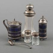 1e gehalte zilveren strooibusje en mosterdpot met blauw glazen binnenbakjes, meester: J.D. Wendels Dz., Schoonhoven, 1908, daarbij: zilveren mosterdlepel met getorste steel, kristallen strooibusje met zilveren monturen, en glazen peper- en zoutstrooier met zilveren dopjes, gewicht zilver 143 gram, strooier 12,5 cm