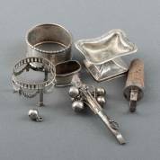 Divers klein zilverwerk, diverse gehaltes en makers, bestaande uit: gehamerde servetring met inscriptie, vingerdoekring met inscriptie, zoutschaaltje, flessenstop, zoutschaaltje met monogram, zoutschaaltje zonder blauw glazen binnenbakje en rammelaar met gebroken natuurstenen greepje, brutogewicht 123 gram -rammelaar defect-