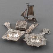 Divers 2e gehalte klein zilverwerk, diverse meesters en jaren bestaande uit: schommelscheepje, twee diverse theezeefjes, pillendoosje met vermeil binnenzijde en tashaak, gewicht 137 gram, hoogte scheepje 8 cm -herstellingen aan grepen theezeefjes-